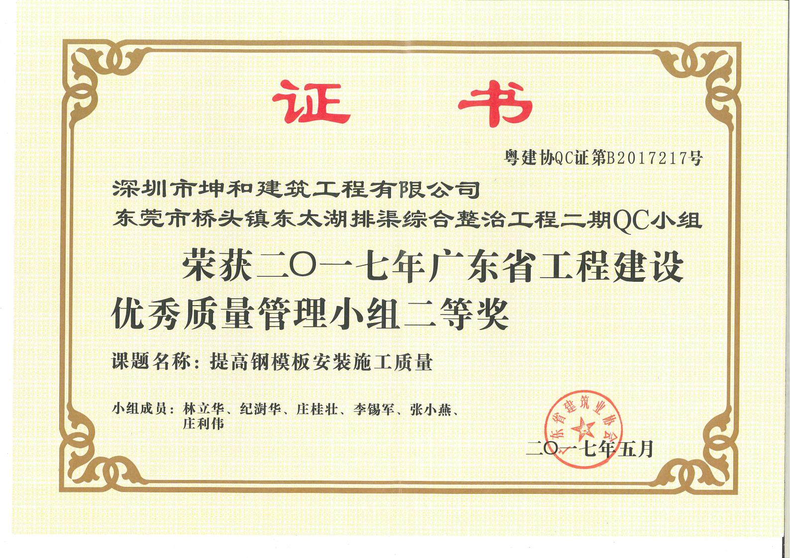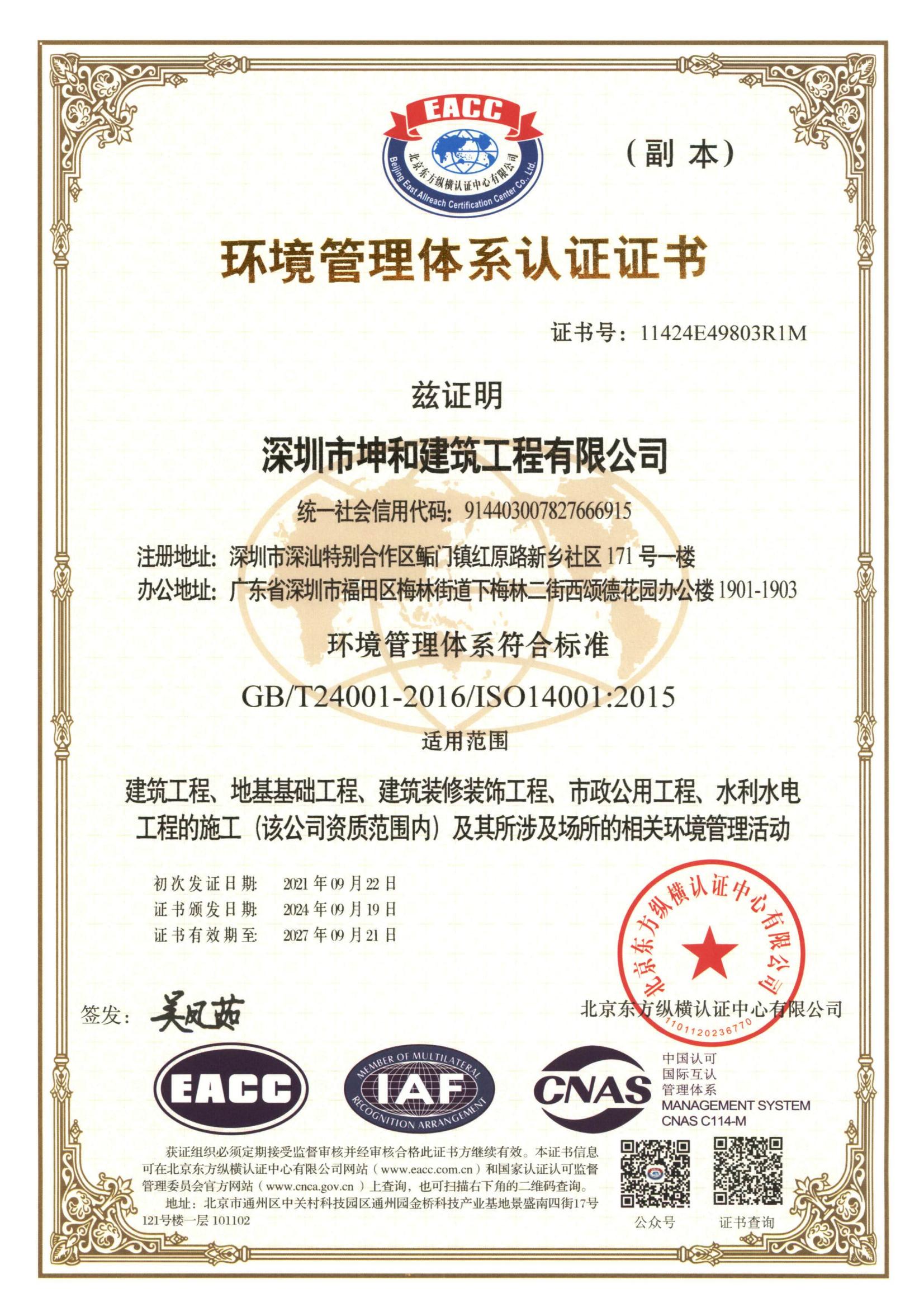 深圳市坤和建筑工程有限公司于二00五年十一月廿八日成立,經(jīng)過(guò)全體員工的共同努力,公司發(fā)展迅速,目前公司注冊(cè)資金為12010萬(wàn)元,是一支具有房屋建筑工程施工總承包一級(jí);市政公用工程施工總承包一級(jí);水利水電工程施工總承包二級(jí);地基基礎(chǔ)工程專業(yè)承包二級(jí);建筑裝修裝飾工程專業(yè)承包二級(jí);建筑機(jī)電安裝工程專業(yè)承包三級(jí);鋼結(jié)構(gòu)工程專業(yè)承包三級(jí)資質(zhì)的專業(yè)施工隊(duì)伍,并于二00六年通過(guò)了ISO9001:2008標(biāo)準(zhǔn)﹑ISO14001:2004標(biāo)準(zhǔn)﹑GT/B2800-2001標(biāo)準(zhǔn)三項(xiàng)管理體系認(rèn)證。